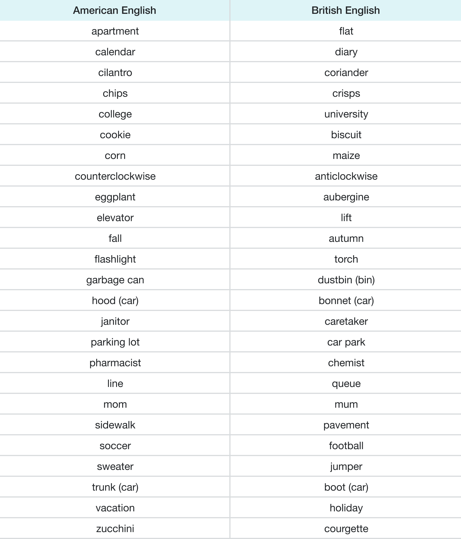 The list of vocabulary differences between the US and UK is long. However, the main ones include: