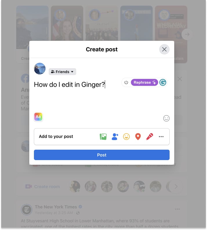 When you add our extension to your browser (available on Chrome, Edge), you can access Ginger’s writing suggestions for all your favorite websites such as Gmail, LinkedIn, Twitter, Facebook, and more.